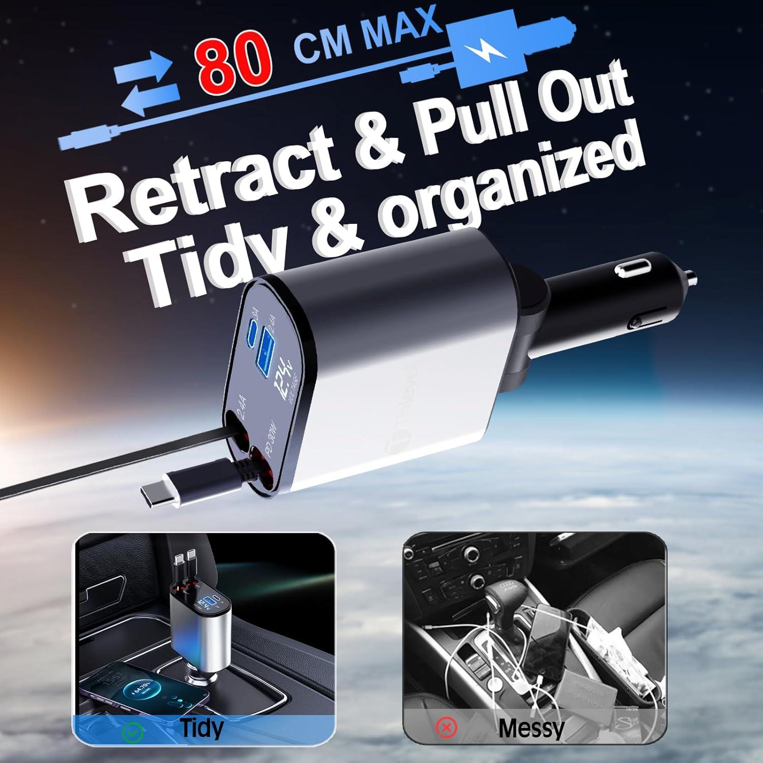 Keep your car neat with built-in retractable cables. Not only can you charge USB-C and iPhone devices, but you can also avoid messy wires. As a result, it helps you stay organized and power multiple devices at once.