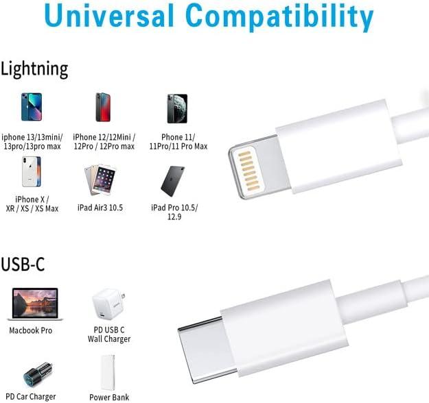 • Universal Compatibility: This type c to lightning cable connects your iPhone 14/13/12/11/Xs/8/7/6/5 all series, iPhone SE 1st Gen/2nd Gen/3rd Gen, iPhone mini 13/12, iPad Pro 10.5 in/9.7 in, iPad Air 3/2/1, iPad mini 5/4/3/2/1, iPad 9th Gen and older, iPod Touch 5th Gen and older, iPod nano 7th Gen.