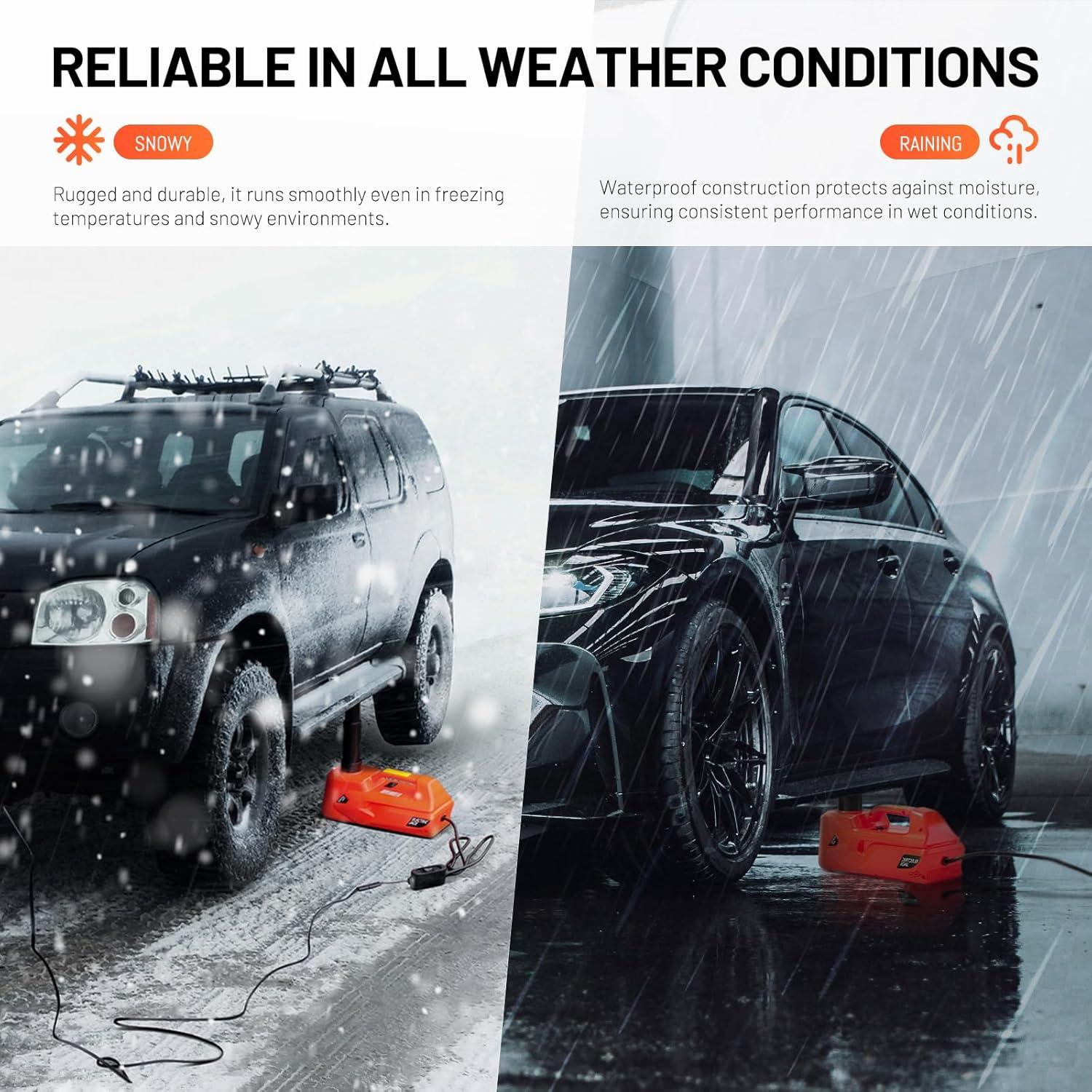 • Powerful Performance: With the ability to lift vehicles weighing under 5 tons, this electric car jack is a dependable tool for a variety of vehicles. Thanks to the built-in double motor, it can effortlessly lift a car or SUV in just 2 minutes. The high-power engine is compatible with almost all types of vehicles, including sedans, SUVs, MPVs, and trucks.